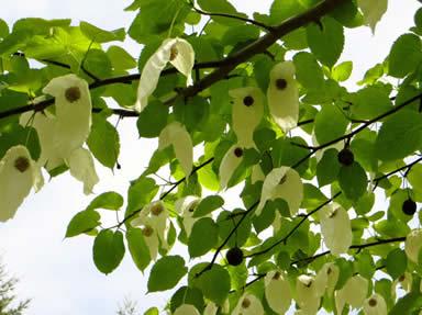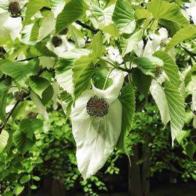 This species is now placed in the Dogwood family which has other members with showy bracts. The bracts of the Dove tree are of unequal size with the larger one up to 15 cm enclosing a small flower cluster with reddish stamens. The nut like fruit is about 3 cm in diameter and contains several seeds which may take 10 to 15 years to produce a flowering tree. Kew Gardens reports a 50% germination rate.