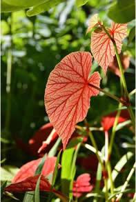 The olive green, angel-winged leaves are veined with dark red and the plum undersides literally glow when backlit. The pendulant pinky white blooms are late comers, perfect for fall colour in the garden, starting in July and continuing until frost.