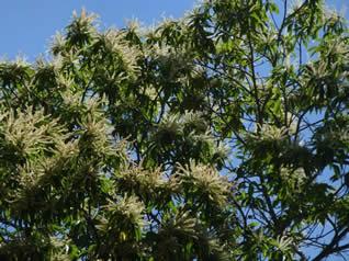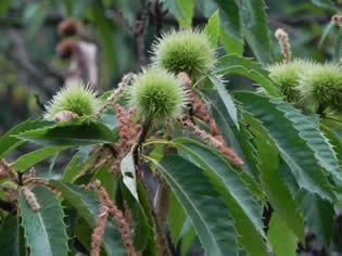 Sweet or Spanish chestnut trees produce the edible chestnuts known from Christmas carols. Trees grow to be huge: Sweet Chestnut trees grow up to 100 ft (30 m) in height. The edible seeds (the chestnuts) emerge from fruit capsules which externally look like a hedgehog curled into a protective ball.  Inside the sharp casing which deter predators are 2 -3, sometimes up to 7 nuts which ripen in October. These are an attractive shiny brown colour, similar to the inedible horse chestnuts. The tree is monoecious, i.e. both male and female flowers are found on the same tree, and they are pollinated by bees.